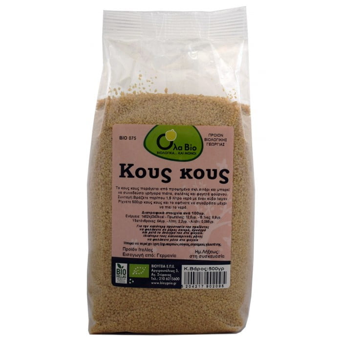 ΚΟΥΣ ΚΟΥΣ ΒΙΟ 500gr Το κουσκούς είναι χοντρόκοκκο σιμιγδάλι το οποίο βρέχεται με νερό, κυλιέται σε αλεύρι και αφήνεται να στεγνώσει στον ήλιο (στην παραδοσιακή του παρασκευή). Στην συνέχεια κοσκινίζεται και φυλάσσεται. Χρησιμοποιείται ως συνοδευτικό για διάφορα κρεατικά (όπως ακριβώς και το ρύζι), για ψητά λαχανικά, για ψάρια. Ακόμα, χρησιμοποιείται και ως γέμιση για λαχανικά όπως ντομάτες, πιπεριές κ.λπ. Προστίθεται σε κρεατόσουπες (και άλλες σούπες), στα όσπρια, σε σαλάτες (το αφρικάνικο ταμπούλι γίνεται με κουσκούς αντί για πλιγούρι). Με γάλα είναι ένα θρεπτικότατο πρωινό, ενώ όταν συνυπάρξει με ζάχαρη, ξερά φρούτα και καρπούς, ροδόνερο και βούτυρο γίνεται ένα ξεχωριστό γλύκισμα. Υποτίθεται ότι υπάρχει ειδική συσκευή, η λεγόμενη κουσκουσιέρα η οποία είναι ένα σκεύος με σίτα αντί για πάτο που προσαρμόζεται σε μια ελαφρά μεγαλύτερη κατσαρόλα. Στην κατσαρόλα βράζουν κρέατα ή λαχανικά (ή και τα δυο μαζί) ενώ στο σκεύος με τη σίτα τοποθετείται το κουσκούς που μαγειρεύεται στον ατμό. Αντί, λοιπόν, για το «ειδικό» σκεύος προσαρμόστε ένα σουρωτήρι σε μια κοινή κατσαρόλα και θα έχετε το ίδιο αποτέλεσα. Ραντίστε το κουσκούς με λίγο νερό, ανακατέψτε, και βάλτε το στο σουρωτήρι. Στην κατσαρόλα μπορείτε, όπως ειπώθηκε, να βράζετε κρέας, λαχανικά, νερό με κύβο κότας-βοδινού-λαχανικών ή σκέτο νερό. Σκεπάστε με το καπάκι της κατσαρόλας. Το κουσκούς θα είναι έτοιμο σε 15′-20′. Στο ενδιάμεσο μην το αφήνετε στην τύχη του, ανακατεύετε συχνά με ένα πιρούνι για να μαγειρευτεί ομοιόμορφα και μην κάνει σβόλους. Εναλλακτικά παρασκευάζεται ως εξής: Βράζετε το νερό σε ένα σκεύος. Το κατεβάζετε από τη φωτιά και προσθέτετε το κουσκούς σε αναλογία 1:1 περίπου. Το αφήνετε 5′ να φουσκώσει και να μαλακώσει και είναι έτοιμο (κάπως έτσι είναι οι οδηγίες που θα βρείτε στα κουτιά του συσκευασμένου κουσκούς).